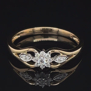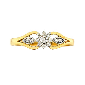This precious 10k yellow gold flower head ring is hand crafted with 0.15 carat of total diamonds. The center is set with a slightly large diamond surrounded with additional diamonds accents set on a flower-shaped to add to glimmer. The shoulders of the ring host 2 small diamonds in each eye frame to create an exquisite look.