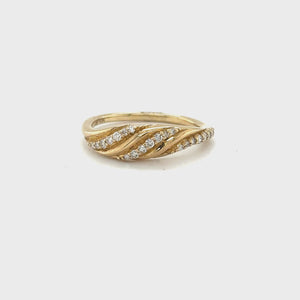 0.17 TDW diamond fancy sparkling twist band in 10K yellow gold. This ring is a charming piece of jewelry with a row of round diamonds. It features a twist design that adds a touch of elegance and sophistication to your look. The diamonds are of high quality and have a brilliant sparkle that catches the light. This ring is perfect for any occasion, whether you want to celebrate a special moment or treat yourself to something beautiful.