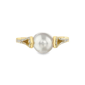 This exquisite ring features a 10K yellow gold band with a split shank design and small diamonds on the sides. The diamonds have a total weight of 0.22 carats and are set in a pave setting that adds sparkle and elegance. The ring also has an 8mm fresh water pearl in the center that is round and white in color. The pearl is set in a yellow gold prong setting that showcases its beauty. This ring is a stunning piece of jewelry that will make you look classy and sophisticated.