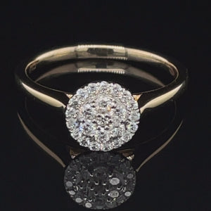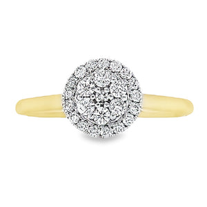 This 10k yellow and white gold diamond solitaire promise ring is handmade with 0.25 carat of total round cut-diamonds. This ring has a round top with 7 slightly larger diamonds set in an inner round surrownded with a halo of diamonds to give it a rich and amazing look. This beautiful look is sure to add a touch of brilliance to your style.