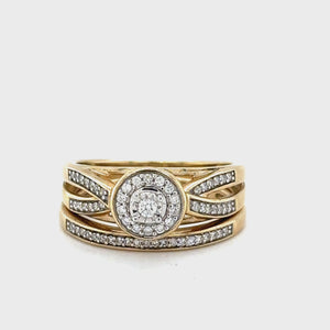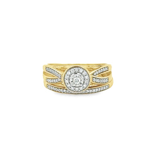 Celebrate your love with this 10K yellow gold bridal set, which has a total diamond weight of 0.25 carats. The set features two rings, an engagement ring and a wedding band. The engagement ring features a round center diamond with a halo of smaller diamonds, forming a beautiful contrast. The band is also embellished with diamonds on either side of the center stone, enhancing the elegance and charm of this set.
