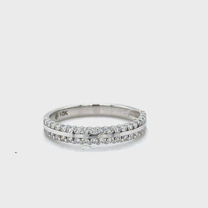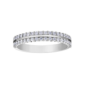 This ring features two rows of small round diamonds, totaling 0.33 carats, set in a prong setting of white gold. It has a band of white gold with a polished finish and a smooth feel. The ring is an elegant and sophisticated piece of jewelry that will make you sparkle.