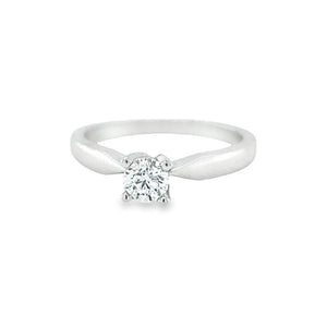 This is a stunning ring that features a 0.40 carat Canadian diamond in a solitaire setting. The diamond is a round brilliant cut and has a high clarity and color grade. The ring is made of 10K white gold and has a four-prong setting that securely holds the diamond. This ring is a timeless and classic choice for your proposal.