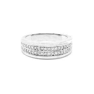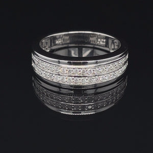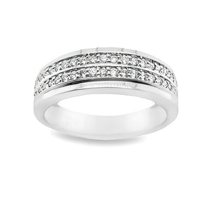 This Diamond wedding channel set band perfectly handmade in highest quality 10k white gold for luxurious shine and feel. This stunning diamond wedding band with a total carat weight of 0.50 ct with 2 rows of small round brilliant cut diamonds embellish the center in white gold bar channel setting to enhance the brilliance. The design of this perfect wedding band focuses on everyone's attention.