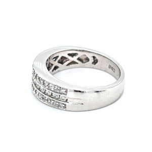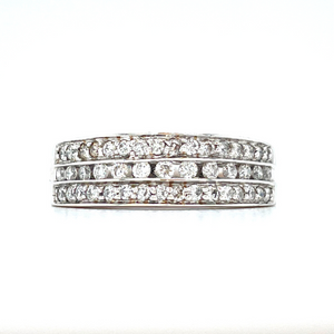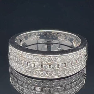 This diamond anniversary band perfectly handmade in highest quality 14k white gold for luxurious shine and feel. This glorious diamond wedding band with a total carat weight of 0.60 ct with 3 rows of brilliant round cut diamonds embellish the center in white gold bar channel setting to enhance the brilliance. The design of this perfect anniversary band catches of everyone's attention.