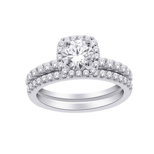 Exquisite 14K white gold lab grown diamond bridal set featuring 1.00 Total diamond weight. The diamond ring hosts a round brilliant 0.75 ct lab-grown diamond in the center with a halo of diamonds. Both the ring and the matching wedding band are adorned with smaller diamonds, totaling 0.25 carats, set along the bands. This bridal set showcases a timeless design with a modern twist that offer brilliance and clarity.