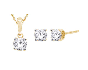 Brilliantly handcrafted this 14K yellow gold jewelry set featuring a pair of stud earrings and a pendant necklace. This beautiful earring and pendant set is adorned with a sparkling 1.00-carat total weight of lab-created diamonds. The pristine white gold complements the brilliance of the diamonds, offering a touch of elegance to any look. Perfect for special occasions or everyday luxury, this set is a testament to timeless style and sustainable beauty.