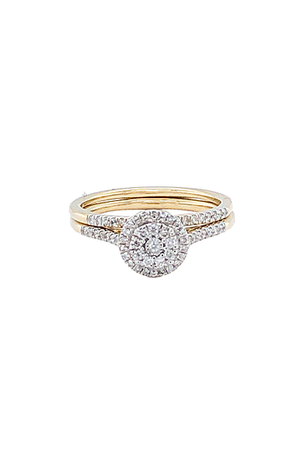 10K Yellow Gold 0.25TDW Diamond Double Round Halo Wedding Set. This rich and impressive wedding set is delicate and looks stunning. Just like the two of you, this diamond bridal set is the perfect pair.