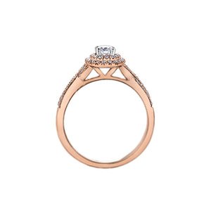 10k rose gold 0.43TDW Canadian diamond halo infinity style engagement ring. This magnificent engagement ring hosts a 0.22ct Canadian diamond center surrounded by a double round halo and an infinity-style side. On the day you ask for her hand, enchant and delight her with this beautiful ring.