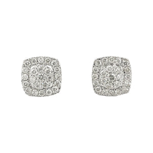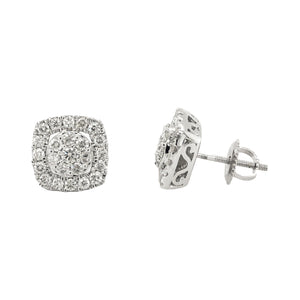 10K white gold 1.00TDW cluster halo diamond earrings. These stud earrings showcase a cluster of sparkling round diamonds at the center, with a cushion shape halo of round diamonds. Finished to a bright polished shine, these stud earrings secures comfortably with screw backs.