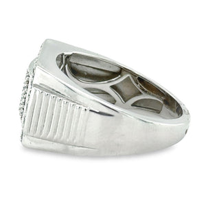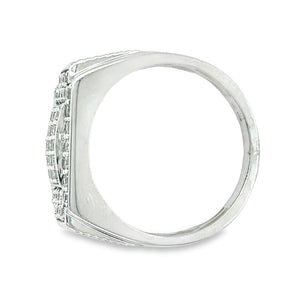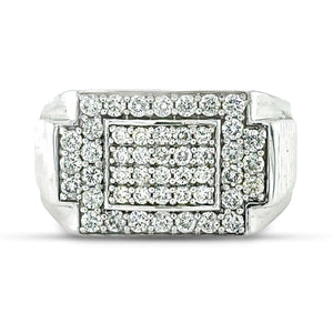 Beautifully hand crafted this stunning men’s diamond ring in 10K white gold and total of 1.00TDW of diamonds. This ring center hosted a rectangular face with a double row of small diamonds around the edge and a larger rectangular area with a single row of small diamonds that adds to its elegance and style. This mens ring is perfect for any occasion, whether it’s a wedding, anniversary, or just a treat for yourself.