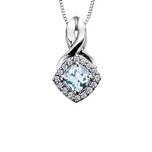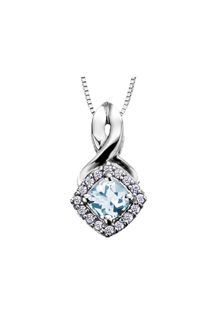 10k White gold 0.08tdw Diamonds and a cushion aquamarine gemstone measuring approximately 4x4mm is beautifully set in a cushion halo setting. Elegant and graceful, this brilliant diamond and aquamarine pendant showcases a halo of sparkling diamonds surrounding the center gemstone. A perfect gift for birthdays, anniversaries, mother's day, and graduation. Matching earrings and a Ring Can be purchased separately to complete the set.