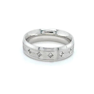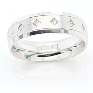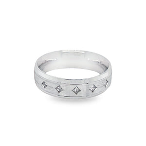 The classic elegance of this diamond wedding band will make a rich style statement for anyone in solid 10k white gold. Purely handcrafted to perfection this band hosts 5 sparkling princess cut diamonds to add to sparkle. A total of 0.12 carat of diamonds are set in 10K white gold with high polish edges and sand blast finish.