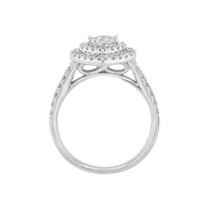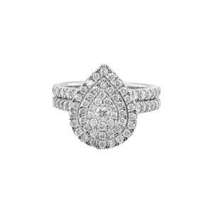 10k White Gold 1.00TDW Pear Shape Diamond Multi Halo Wedding Set. This beautiful pear shape wedding set has a unique and elegant look. This ring is set with 78 natural brilliant cut diamonds weighing a total of 1.00 carat. Simple and classy sides with a thin line of diamonds on the shoulders and a matching band to complete the ensemble. Just like the two of you, this diamond bridal set is the perfect pair.