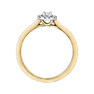 This elegant engagement ring features a stunning emerald cut diamond in a white gold halo setting, complemented by a yellow gold band. The ring has a total diamond weight of 0.20 carats and is crafted from 10K yellow and white gold. This ring is a perfect choice for expressing your love and commitment.