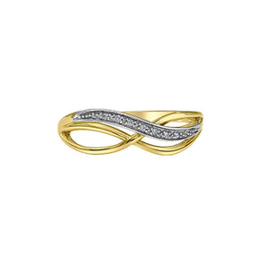 Celebrate timeless elegance with this 10K yellow gold fancy band, featuring a graceful infinity symbol design. One half of the loop is adorned with shimmering 0.03 carat total diamond weight (TDW) accents set in a contrasting white gold or rhodium-plated finish, adding brilliance and depth. The polished gold band offers a sleek, modern look while symbolizing eternal love and commitment. This ring is a stylish and modern accessory for any occasion.