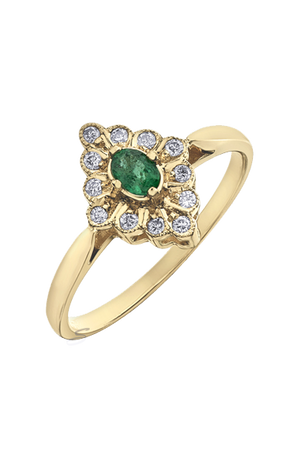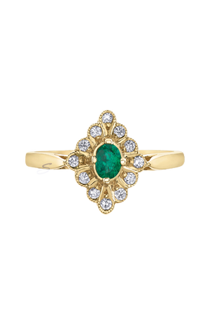 10k yellow gold emerald and diamond ring. This is a vintage-style ring with a 4x3mm oval genuine emerald set in the center surrounded by 0.12tdw of diamonds. Matching earrings and pendants can be purchased separately to complete the set.
