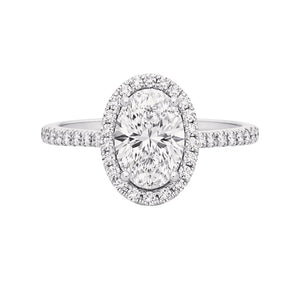 14k white gold 1.46tdw lab grown halo diamond engagement ring with side diamonds. This stunning ring hosts a 1.06-carat center oval lab grown diamond surrounded by a duo of smaller diamonds in an oval halo. Side diamonds complete the ensemble adding to style and elegance. The center diamond will be IGI certified and the certificate will accompany the ring.