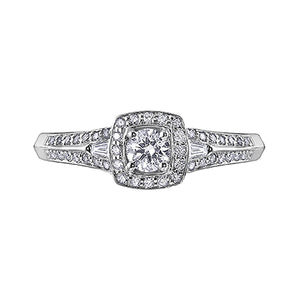 14K White Gold 0.45TDW diamond halo engagement ring with a round 0.17ct Canadian diamond center solitaire surrounded with a beautiful cushion halo of smaller diamonds and a split shank on the sides to make this ring look glamourous. This magnificent Canadian diamond engagement ring will bring a smile to her face and joy in her life.