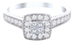 14K White Gold 1.25TDW Diamond Princess Cut Halo Bridal Ring. This stunning ring comprises four princess-cut diamonds hosted the center surrounded by a halo of 12 smaller diamonds enhance the brilliance. On the day you ask for her hand, enchant and delight her with this beautiful halo ring with a beautiful setting encompassing one row of diamonds on each side. Perfect for any occasion, at weddings, engagements, anniversaries, valentine's day or surprise her for a special occasion or celebration.