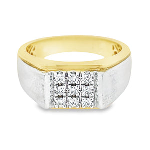 This beautiful Ring is the perfect way to accessorize a formal wardrobe with its brilliant design. Meticulously handcrafted to perfection this ring has center-hosted 9 sparkling round big diamonds to add attractive look. A total of 0.33 carat of diamonds are set in 14K yellow and white gold with high polish edges and sand blast finish on white gold shoulders.