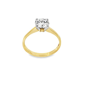 This exquisite 14K yellow gold engagement ring featuring a 1.01-carat lab-grown diamond. The ring has a simple yet elegant design with a round brilliant-cut diamond set in a four-prong setting. The yellow gold band is polished and smooth, providing a classic and timeless look. The lab-grown diamond is clear and sparkly, making it an attractive and eco-friendly alternative to natural diamonds. This ring is a perfect choice for anyone who loves a classic and simple design.