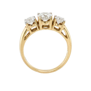 14k yellow gold 1.50TDW three diamond past present and future ring. This celebration ring comprises of only three diamonds each weighing about the same and adding up to 1.50 total diamond weight. Evocative of your cherished past, present, and future with your beautiful bride-to-be. Show your love for your sweetheart by choosing this exclusive 1.50tdw total weight diamond ring. This stunning ring is a piece of jewel that will certainly amaze you. Diamond clarity: SI2-I1. Diamond color: G-H. Cut grade: Good.
