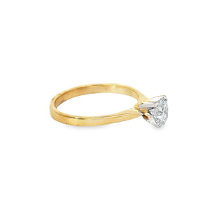 This ring features a 0.56-carat lab-created diamond that shines brilliantly atop a 14K yellow gold band. The round cut diamond is elegantly secured by a simple prong setting, highlighting its clarity and size. The polished finish of the yellow gold band adds a warm glow, making this ring a classic and radiant choice for any special occasion.