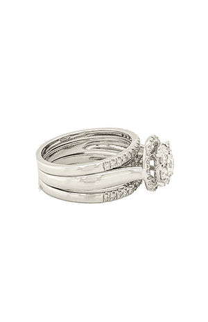 14K White Gold 0.75TDW Diamond Illusion Imperial Style 3 Piece Wedding Set. Just like the two of you, this diamond bridal set is the perfect set. This Lustrous engagement ring host a large imperial illusion head with a halo of round diamonds giving it a Rich and Glamourous look with the polished band. Set comprises of two wedding bands to jacket the ring with love and make it complete. Consisting of 60 round brilliant cut diamonds weighing a total of 0.75 carats this is a stunning set.