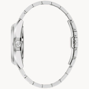 Defined by exceptional quality and sophisticated aesthetics, the Bulova men’s Surveyor is the quintessential modern timepiece. Sculpted edges and faceting distinguish the silver-tone stainless steel case, with polished and brushed finishing, a flat sapphire crystal, and a 3-link stainless steel bracelet with a push-button deployment clasp with easy-release latched spring bars. The radiant light blue dial has a sunburst finish and silver-tone accents, hands with luminescent fill, cutout minute markers, a magnified date display, and a recessed minute track. The watch is powered by an automatic movement with 21-jewels and a 42-hour power reserve, which can be seen through an exhibition window on the case back. For those with a discerning eye for refined luxury, this Bulova men’s timepiece is the obvious choice.