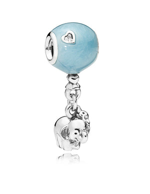 The positive symbolism of the elephant makes this sterling silver dangle charm a talisman of luck. Crafted from sterling silver, it's shaped as a blue enamel balloon with a dangling elephant. A heart-shaped cubic zirconia completes the pretty piece, made for Pandora Moments bracelets.