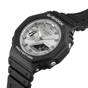 Go metallic faced in cool, sophisticated color with a slim GA2100 that inherits the design concept of the first-ever G-SHOCK. The polished gleam of metallic color and the iconic octagonal form of the DW-5000C, the original G-SHOCK, come together in a rugged digital analog combination timepiece measuring just 11.8mm from bezel to case back. A slim design with the same tough G-SHOCK construction. Finished beautifully with a circular hairline treatment, the dial is also treated with silver-color vapor deposition, as are the index marks. Add a bezel and band in matte black for a timepiece that makes a bold and elegant statement.