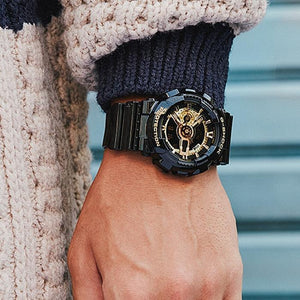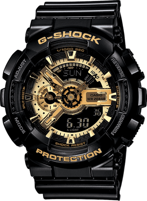 G-Shock adds high gloss finishes and gold dials to its X-Large case designs for a visually powerful look. Black resin band analog and digital watch with gold face. Case / bezel material: resin. Resin band, magnetic resistant. Shock resistant, mineral glass. 200-meter water resistance. Size of case : 55 x 51.2 x 16.9mm. LED light. Auto light switch, selectable illumination duration (1.5 seconds or 3 seconds), afterglow. World time, 29 time zones (48 cities + coordinated universal time), daylight saving on/off, Home city / World time city swapping. 1/1000-second stopwatch. Measuring capacity: 99:59'59.999''. Measuring modes: Elapsed time, lap time, split time. Others: Speed (0 to 1998 units/hour), Distance input (0.0 to 99.9). Countdown timer. Measuring unit: 1 second. Countdown range: 24 hours. Countdown start time setting range: 1 minute to 24 hours (1-minute increments and 1-hour increments). Other: Auto-repeat. 5 daily alarms (with 1 snooze alarm). Hourly time signal. Full auto-calendar (to year 2099). 12/24-hour format. Regular timekeeping. Analog: 2 hands (hour, minute (hand moves every 20 seconds)), 1 dial (speed). Digital: Hour, minute, second, pm, month, date, day. Accuracy: ±15 seconds per month.