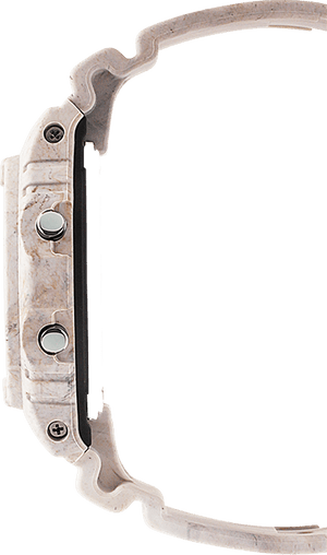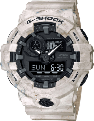 G-Shock introducing the UTILITY WAVY MARBLE series. These timepieces combine the toughness that has been very much a part of the G-SHOCK since 1983 with designs and hues that bridge the gap between urban and outdoor, everyday and extraordinary, and a wide range of fashions. Mixed color resin molding technology is used to create designs that recall geological formations expressing the majesty of the planet Earth. The combination digital-analog GA700WM features a large bezel and bold design in the tan marbled colorway. 200 Meter water resistant. Size of case : 57.5 x 53.4 x 18.4mm. Super Illuminator LED Light with Afterglow (selectable illumination duration 1.5 or 3 seconds). World Time, 31 times zones (48 cities + UTC), daylight saving on/off, home city/world time swapping. 4 Daily Alarms and 1 Snooze Alarm. Hourly Time Signal. 1/100 Second Stopwatch. Measuring capacity: 23:59'59.99". Measuring modes: Elapsed time, split time, 1st-2nd place times. Others: target time alarm, direct timing start from timekeeping mode. Countdown Timer. Measuring unit: 1/10 second. Countdown range: 60 minutes. Countdown start time setting range: 1 minute to 60 minutes (1-minute increments). Hand shift feature (hands move out of the way to provide an unobstructed view). Full auto-calendar (pre-programmed until the year 2099). 12/24 Hour Formats. Accuracy: ± 15 seconds per month.