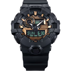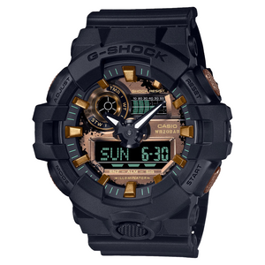 G-Shock dnalog-digital GA-700 series quartz mens watch GA-700RC-1A. Size of case 53.4mm. Resin case and bracelet with black dile. Shock resistant mineral glass. 200 meter water resistance. Buckle clasp.