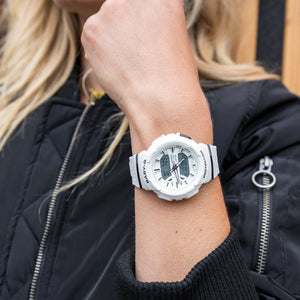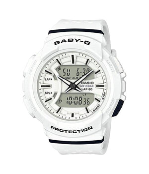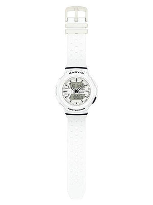 G-Shock Baby-G women's watch BGA240-7A. The BGA-240 Series is a new model designed for runners. Coloring that matches today's sportswear, hour markers that are designed for ease of reading, and sharp analog hands that create a sense of speed, all add up to a design suitable for sportswear. The band is punched with holes creating a motif that resembles today's sports fashion items. It also allows air to pass through for cooling while engaged in sports. The inside of the band has a protector that enhances the fit to the wrist. Case / bezel material: resin. Resin band, neobrite. Shock resistant, mineral glass. 100-meter water resistance. Size of case : 46.4 x 42.6 x 15.3mm. LED light. Auto light switch, selectable illumination duration (1.5 seconds or 3 seconds), afterglow. Dual time. 1/100-second stopwatch. Measuring unit: lap time (1/100 second (for the first 60 minutes), 1 second (after 60 minutes)). split time (1/100 second (for the first 10 hours), 1 second (after 10 hours)). Measuring modes: Elapsed time, lap/split times, 1st-2nd place times. Memory capacity: 60 records (used for lap times and split times). Countdown timer. Measuring unit: 1 second. Countdown range: 24 hours. Countdown start time setting range: 1 minute to 24 hours (1-minute increments and 1-hour increments). Other: Auto-repeat. 3 multi-function alarms (with 1 snooze alarm). Hourly time signal. Full auto-calendar (to year 2099). 12/24-hour format. Button operation tone on/off. Regular timekeeping. Analog: 2 hands (hour, minute (hand moves every 20 seconds)). Digital: Hour, minute, second, am/pm, month, date, day. Accuracy: ±30 seconds per month.
