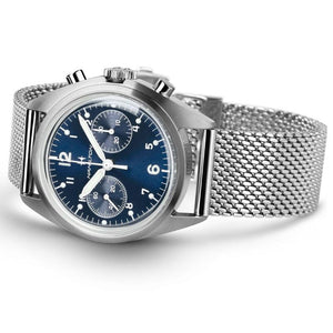 Rugged and reliable, the Khaki Pilot Pioneer Mechanical Chronograph pays homage to Hamilton's vintage military aviation watches. Powered by our exclusive hand-wound H-51-Si movement, this timepiece boasts a 60-hour power reserve and a stunning Aviation Blue dial with a sunray finish.