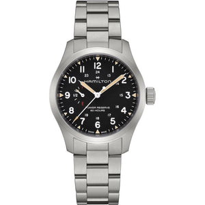 The Khaki Field Mechanical Power Reserve 40mm honors the heritage design and essential functionality of the Khaki family, while introducing modern features and the latest in watchmaking technology and innovation. With a new manual-winding H-23 movement, developed by ETA exclusively for Hamilton, it allows (for the first time) for the 80-hour power reserve to be visualized directly on the dial. Fitted with a stainless steel metal bracelet, the black dial proudly displays "power reserve 80 hours" and shows "F" for full and "E" for empty, to underscore this exceptional and utility-focused feature.
