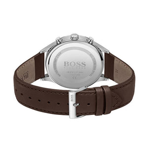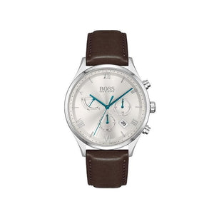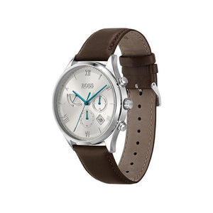 This Hugo Boss watch has a stainless steel case 44mm in diameter and is fitted with a brown leather strap. Inside the case lies a movement and the watch features a mineral crystal. Silver white dial with silver case, tang buckle clasp. Water resistance upto 50 meters.