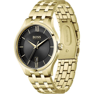 The Boss Mens Elite Watch 1513897 combines a 41mm round shaped gold tone case and bracelet with a push button deployment clasp. It has a black analogue dial with a date window at six o-clock, which is protected beneath mineral crystal glass. Power is generated by the quartz movement. This model also has a water resistance of up to 50 meters.