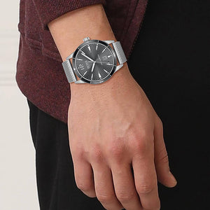 This Hugo Boss watch has a stainless steel case 42mm in diameter and is fitted with a metal strap. Inside the case lies a movement and the watch features a mineral crystal. Gray dial color with silver case, buckle clasp. Water resistance upto 50 meters.