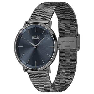 This Hugo Boss watch has a stainless steel case 40mm in diameter and is fitted with an ionic plated gray steel case and bracelet. Inside the case lies a movement and the watch features a mineral crystal. Blue dial color, tang buckle clasp. Water resistance upto 30 meters.