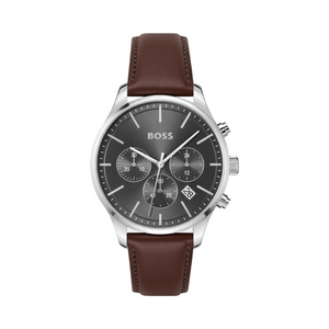 The BOSS Avery 1514155 is a stylish men's chronograph watch that keeps you in time day in and day out. The stainless steel watch is equipped with a dark gray dial protected by durable mineral glass. The watch face has three lower sub dials with chronograph/stopwatch features and a date between four and five o'clock. The width of the watch case is 42 mm, and the thickness is 10 mm. The brown strap made of genuine leather has a length of 145 to 190 mm and a width of 20 mm at the attachment point. The BOSS Avery 1514155 is water resistant to 50m / 5atm, i.e. it is waterproof to a limited extent (swimming is not recommended).