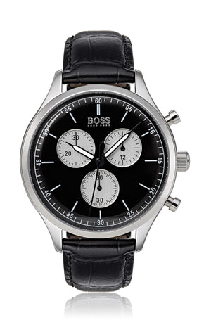 Hugo boss companion 1513543 with a contrasting chronograph design, this watch by boss is a statement piece with monochromatic intrigue. Quartz movement ensures accurate time-keeping with minimal effort so you can arrive fashionably on time. Chronograph scratch-resistant sapphire crystal. Alligator-embossed leather strap with pin buckle. Logo detail on dial Stainless steel case. Case diameter 42 mm. Water resistance 5 ATM (165 feet).