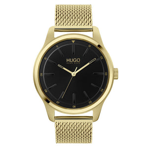 Hugo Boss #dare 1530138 is an amazing and attractive men's watch from #DARE collection. 42mm gold thin ionic plated stainless steel case, black dial, gold thin ionic plated steel mesh bracelet. Quartz movement. Mineral crystal. Water resistance upto 30 meters.