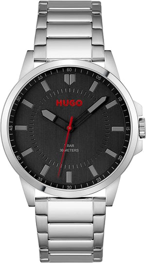 This smart HUGO men's watch from the #FIRST family features a 43 x 9mm stainless steel case, black dial with grey accents and a red second hand. Finished with a stainless steel bracelet with a push button deployment clasp. Water resistant to 30m. Quartz movement.