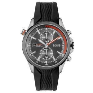 Hugo boss quartz men's watch 1513931. Stainless steel case with black silicone strap, grey dile. Water resistance up to 100 meters. Case size 46 mm. Quartz movement. Mineral crystal. Buckle clasp.