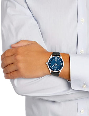 A no-gimmick watch; the Hugo Boss Governor is clean, good looking and fits in anywhere, be it a corporate workplace or a banquet dinner and other similar occasions. The Governor has a very slender profile as opposed to the bulk most men's watches come with due to its inspirations from the classic and iconic watches of the yesteryears. It has a smooth touch further enhanced by a rich leather strap that gives its basic look a trendy edge. Stainless steel case and blue textured dial. Swiss quartz movement, mineral crystal glass. Case size 43mm. Water resistance upto 30 meters.