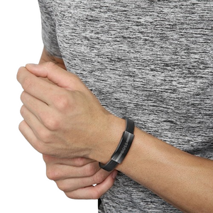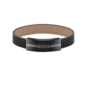 This Hugo Boss Jewellery 1580490M men's black leather bracelet from the Luke collection, featuring brushed black IP stainless steel detail, black ion-plated logo-embossed magnetic fastening. This bracelet measures approximately 19cm and is perfect for everyday wear.