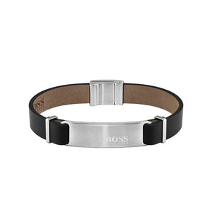 This gents Hugo boss jewellery men's black leather urbanite bracelet 1580044M is sure to enhance your style from the second it is worn. From the iconic brand of BOSS, this versatile leather bracelet is tremendously made and will turn heads at any occasion. Signature logo engraved in silver tone hardware and interior strap. Magnetic clasp closure. Length 20cm.